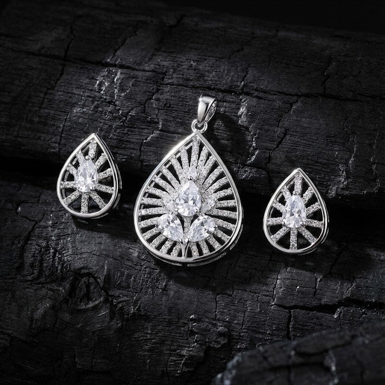 Discover intricate artisan design with this stunning Silver Plated Teardrop Pendant & Earring Set. This premium 2-piece ensemble features expertly crafted 22k silver plating with high-quality zirconia stones, showcasing a sophisticated teardrop silhouette with a central floral cluster and delicate radiating spokes for a high-jewelry aesthetic.