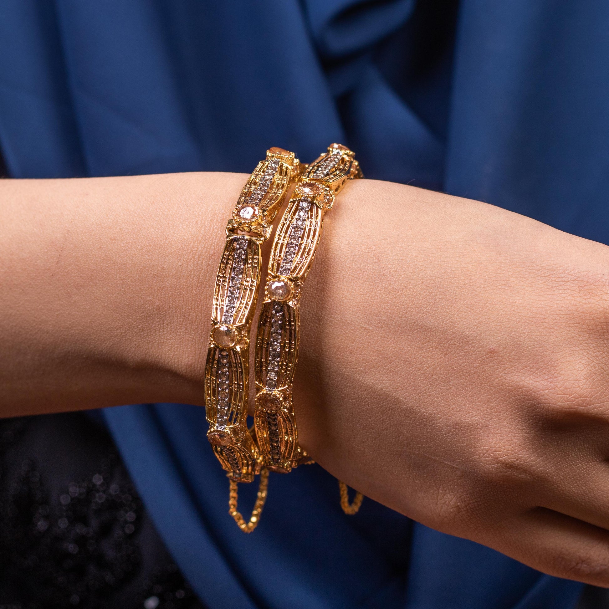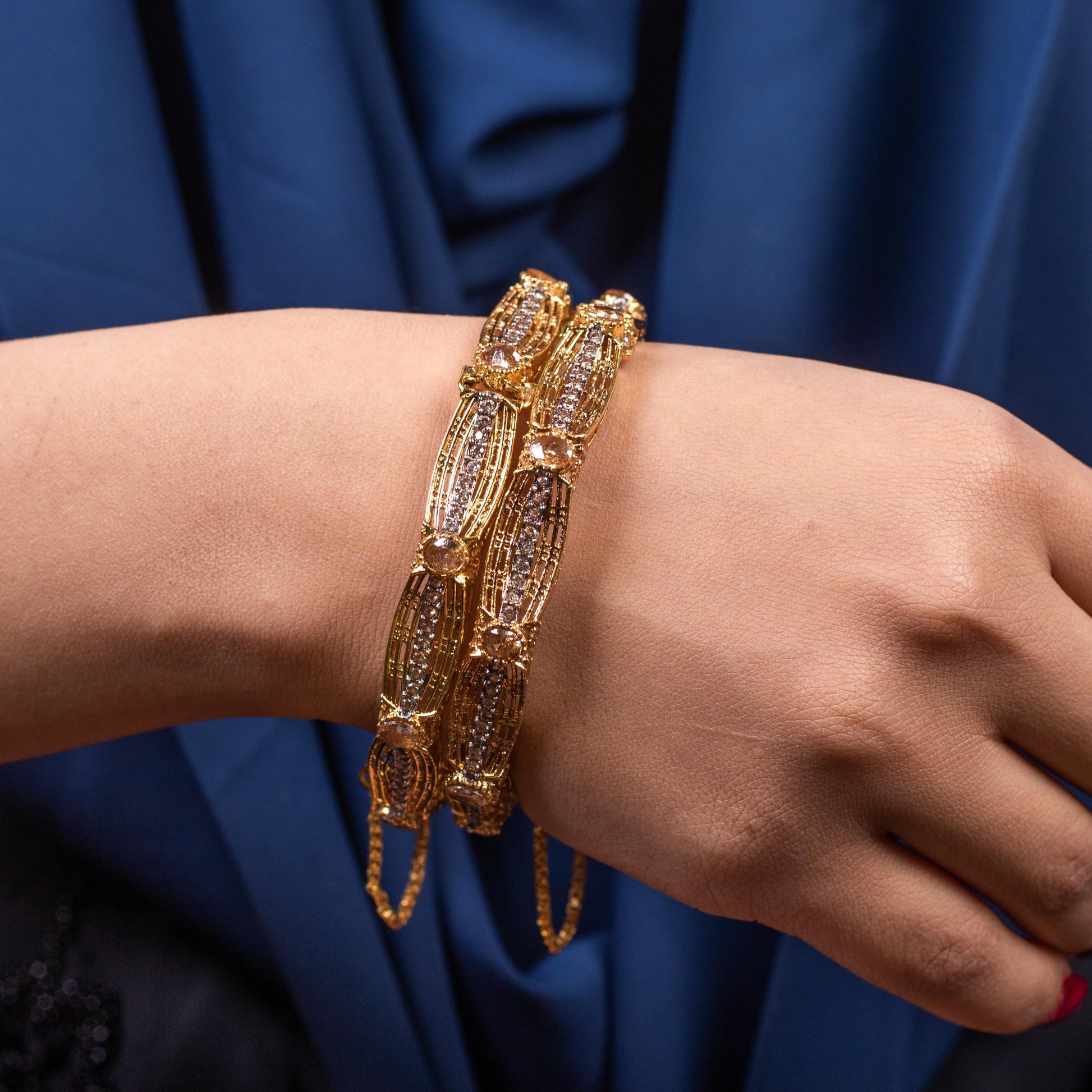 Experience the grandeur of tradition with our Stone Bangle Champagne, exquisitely crafted to add a royal touch to your jewelry collection. These handmade openable bangles feature intricate Meenakari and Navratan work, beautifully adorned with vibrant stones. The delicate paisley motifs and fine detailing reflect the timeless charm of heritage craftsmanship.