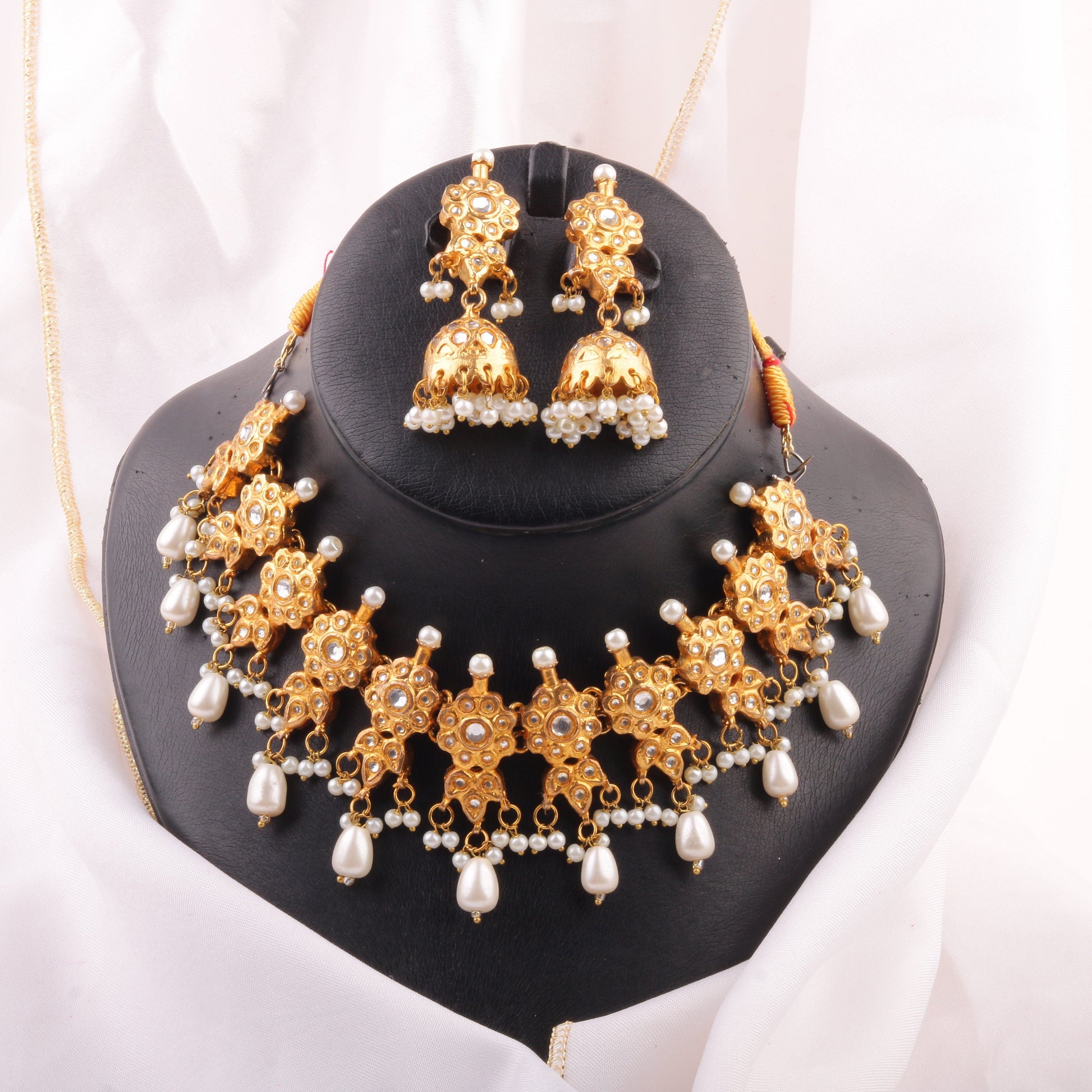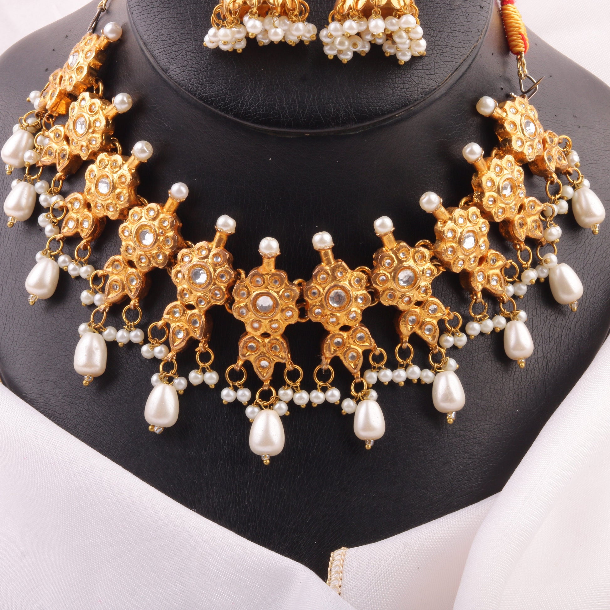 This exquisite handmade choker set is a timeless blend of elegance and tradition. Crafted from premium-quality Laak Kundan, the intricate floral motifs are adorned with rich green and white detailing, adding a regal charm to your look. The delicate pearl embellishments enhance its grace, making it a perfect statement piece for weddings and festive occasions.