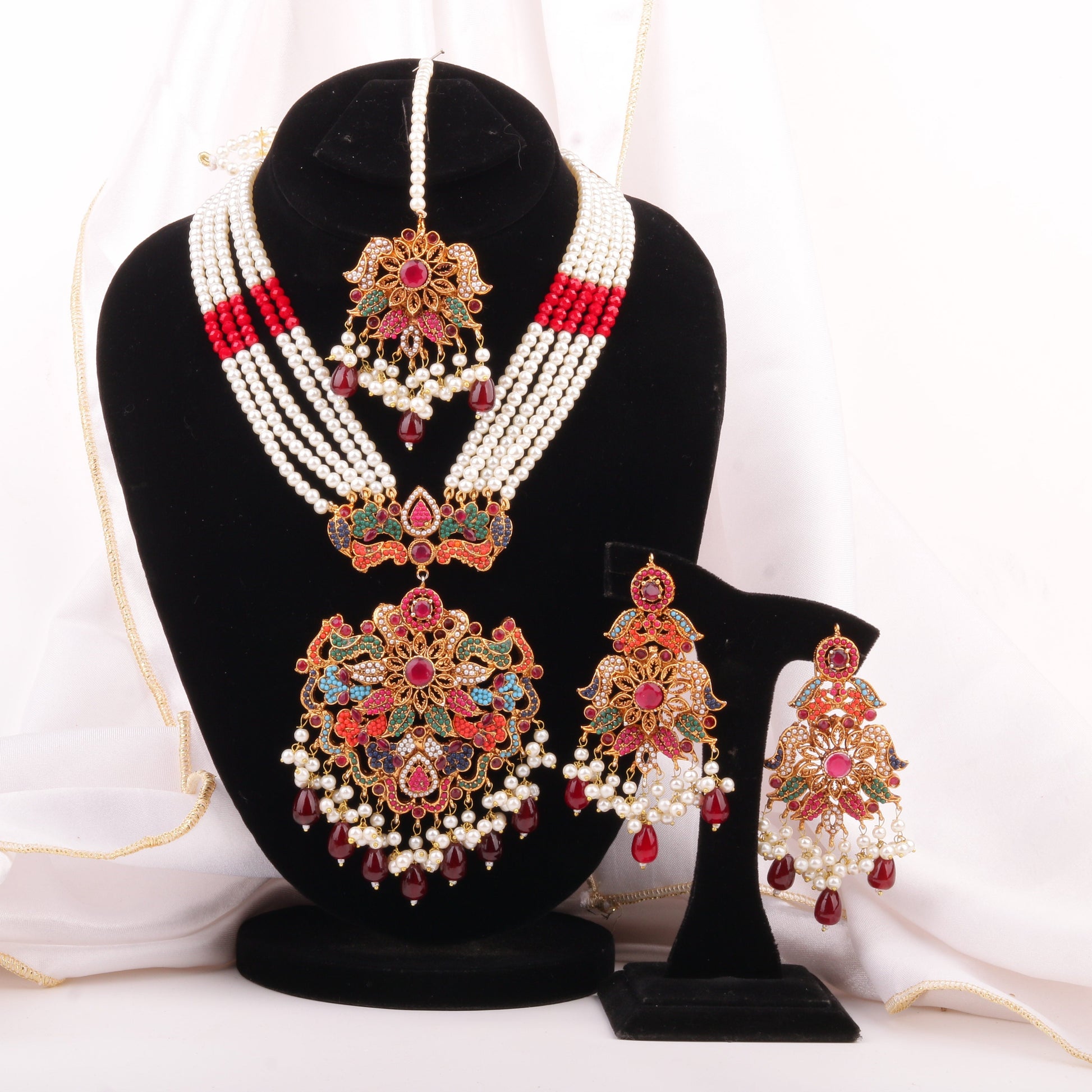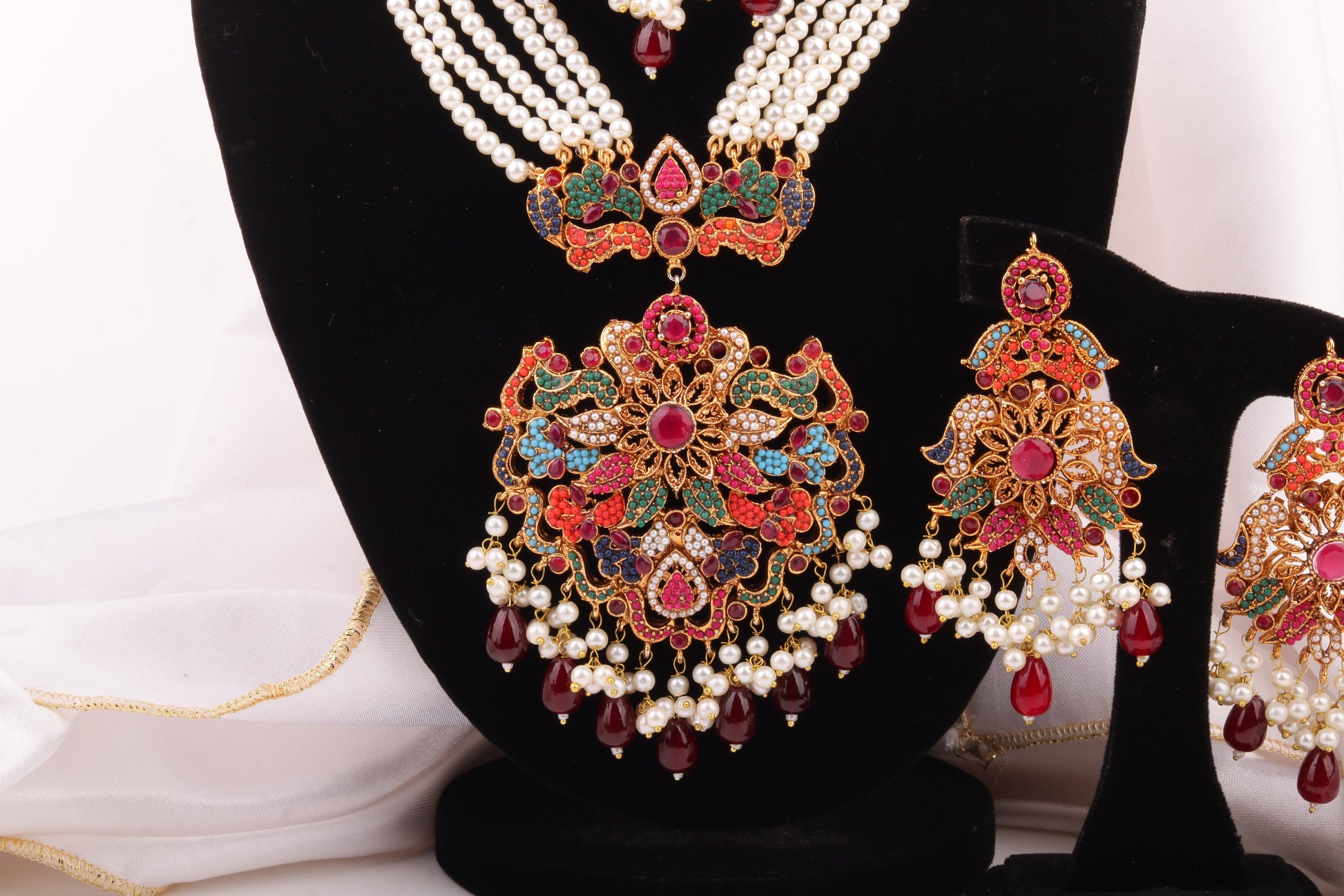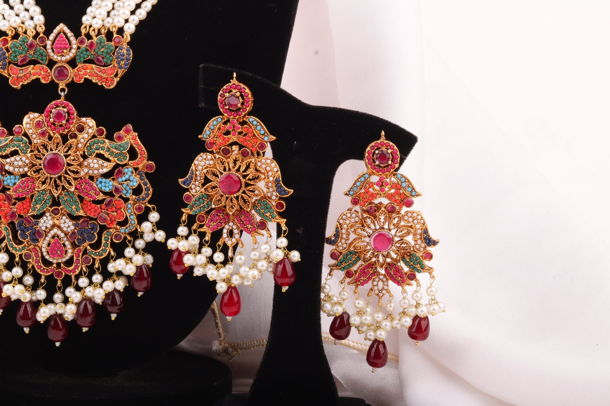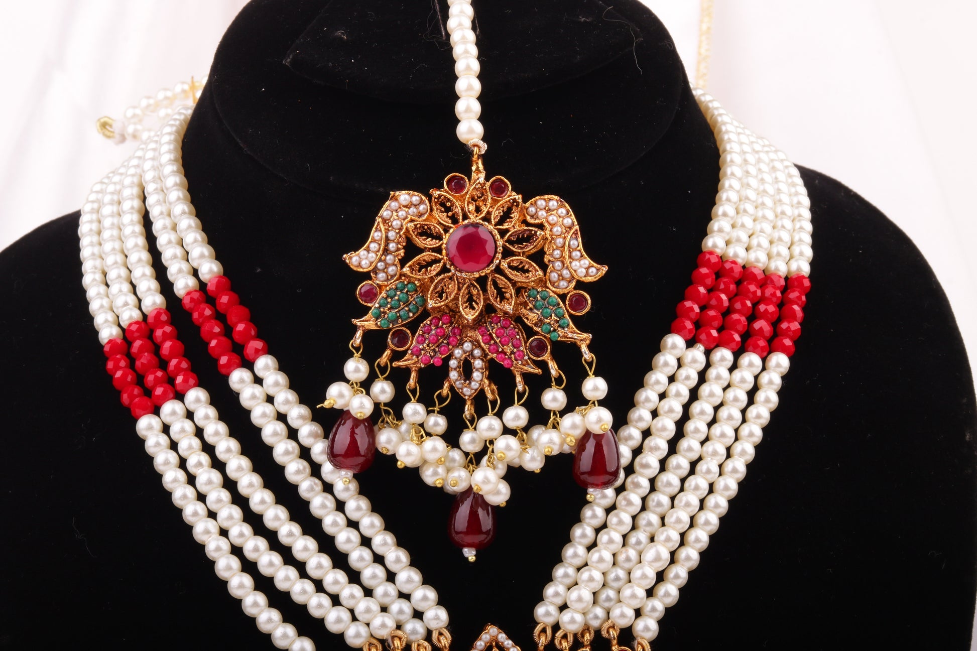 Elevate your ethnic style with this stunning Navratna Maala Set, a perfect combination of elegance and tradition. The set features a meticulously designed multi-strand pearl necklace adorned with vibrant Navratna stones, exuding a royal charm. Complementing the necklace are exquisite 2.5-inch earrings crafted with intricate detailing and finished in premium 22K Gold Polish. The striking red and gold hues paired with delicate pearls make this set a timeless treasure for every festive or celebratory occasion.