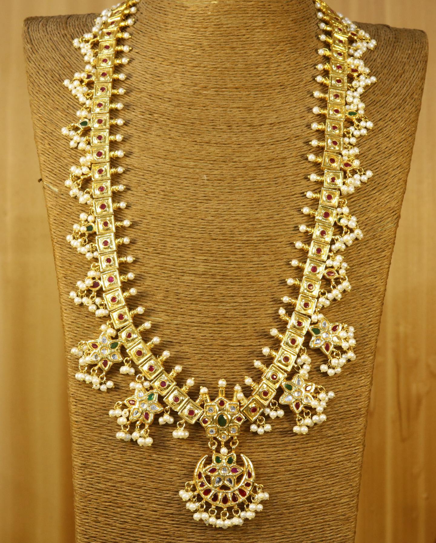 Step into royalty with our Traditional Long Haar Kundan Set , a breathtaking fusion of tradition and elegance. This grand necklace features intricate gold-plated detailing with fine Laak kundan work, enhanced by delicate pearl embellishments. The pendant and statement earrings add a regal charm, making it the perfect choice for brides and festive occasions.