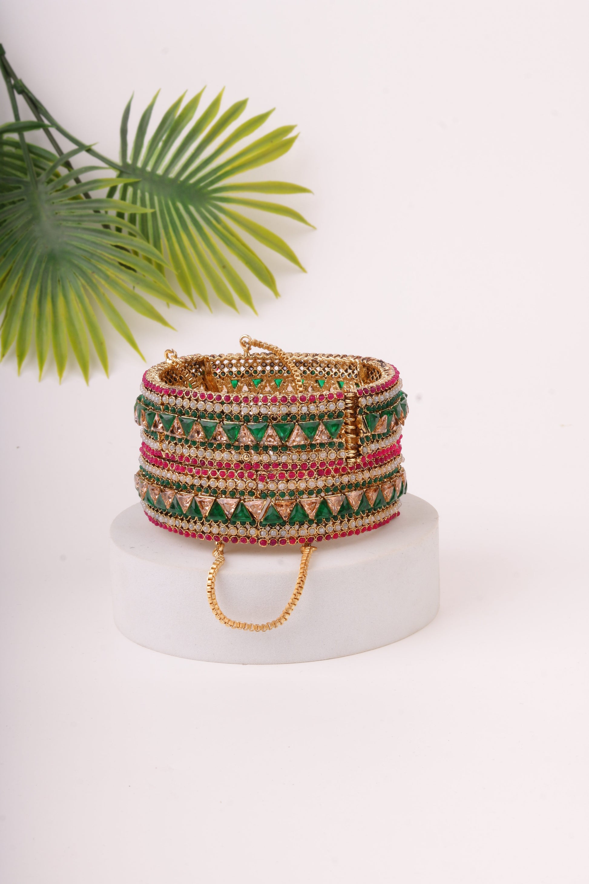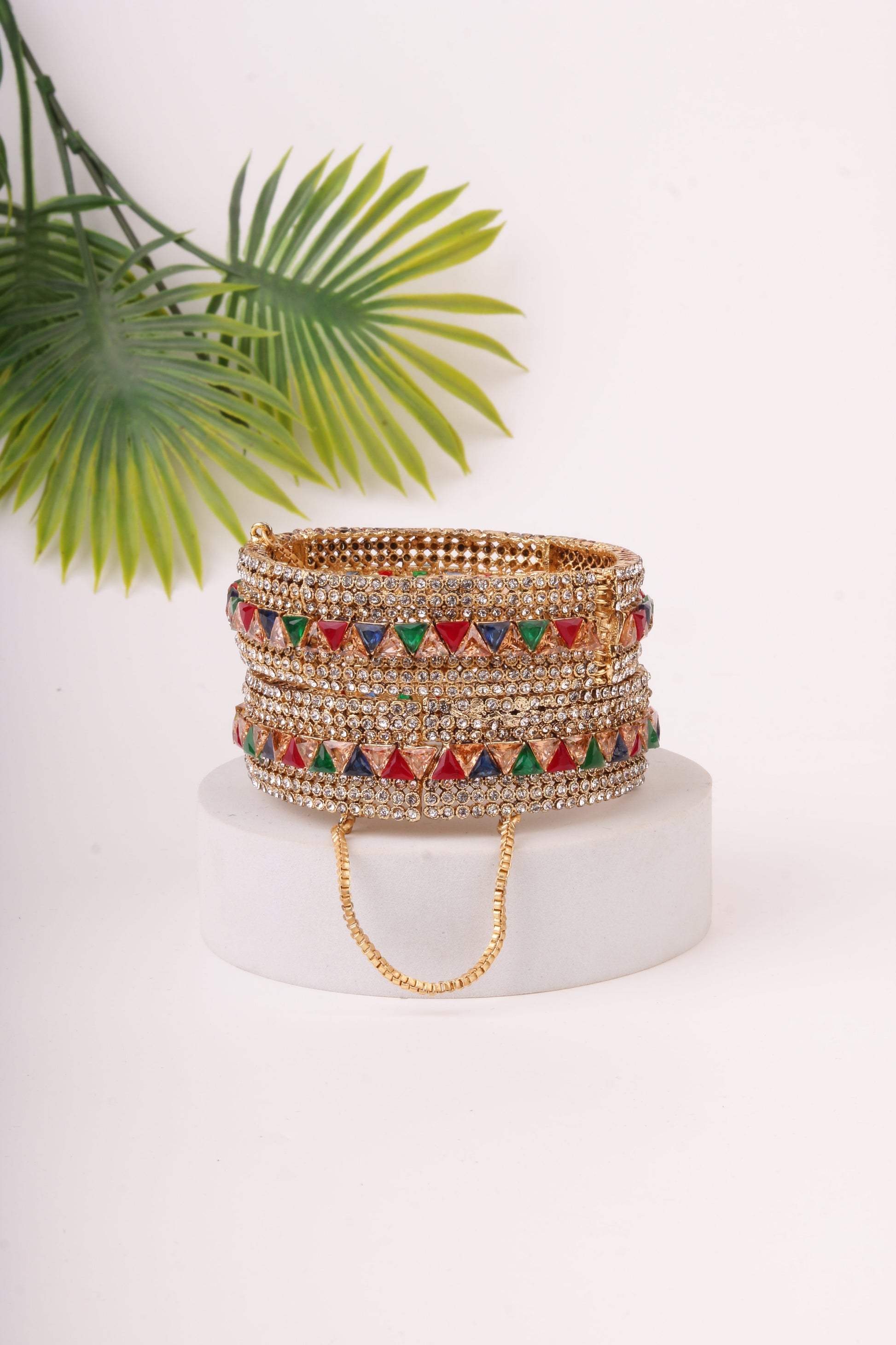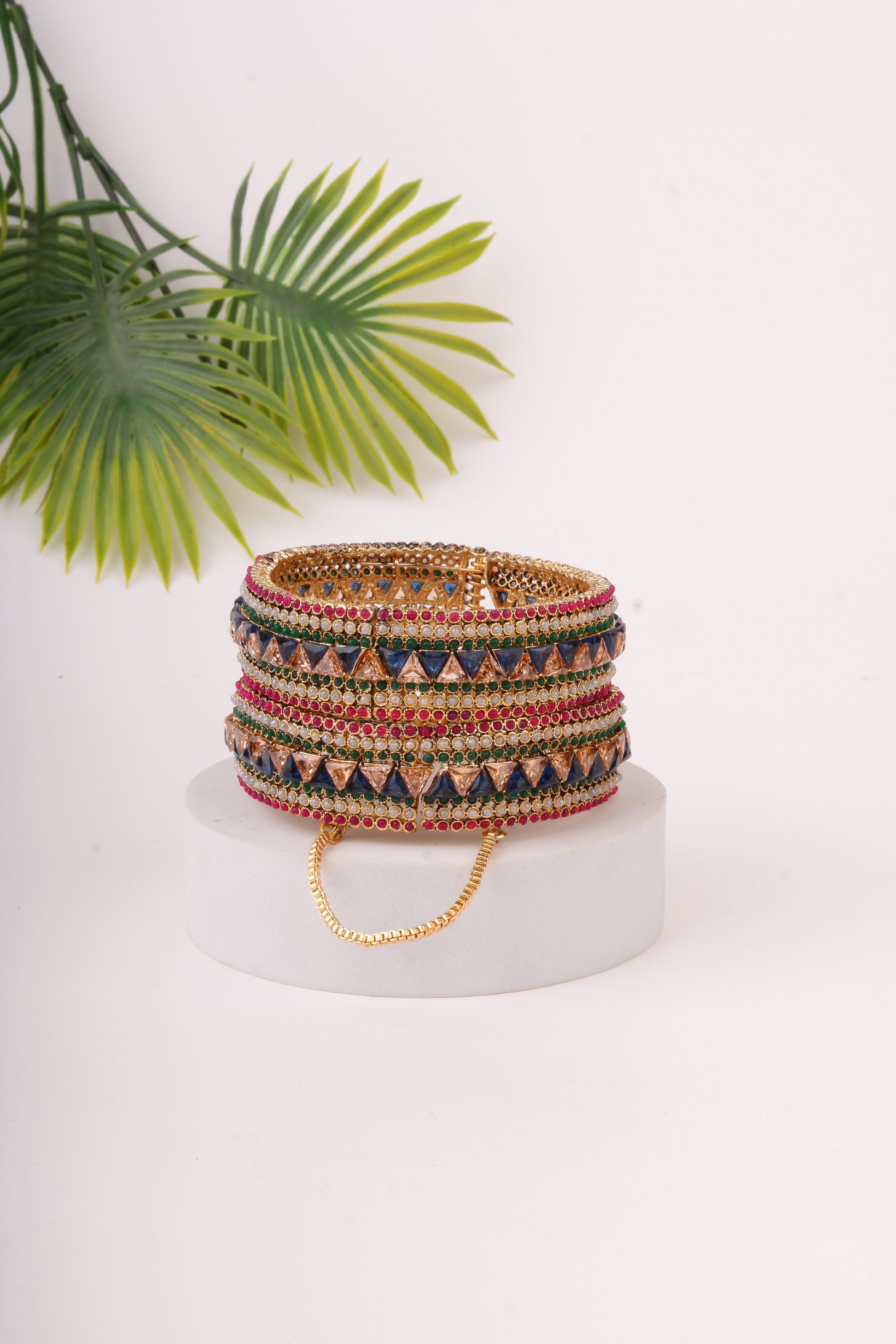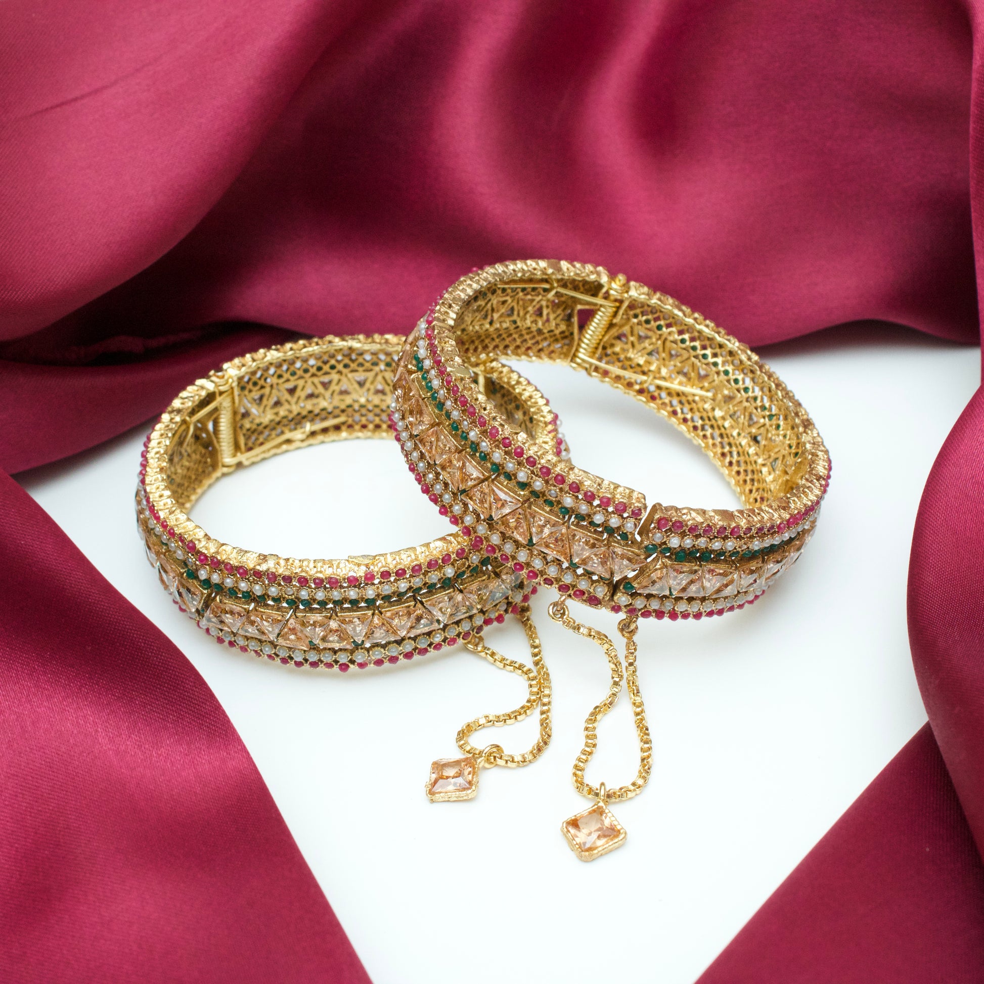 Experience timeless elegance with the Golden Empress Openable Bangles, a masterpiece of craftsmanship that blends intricate detailing with the brilliance of premium 22K gold-plated polish. Each bangle features a stunning fusion of geometric and floral elements, embellished with dazzling stones that radiate sophistication and charm.